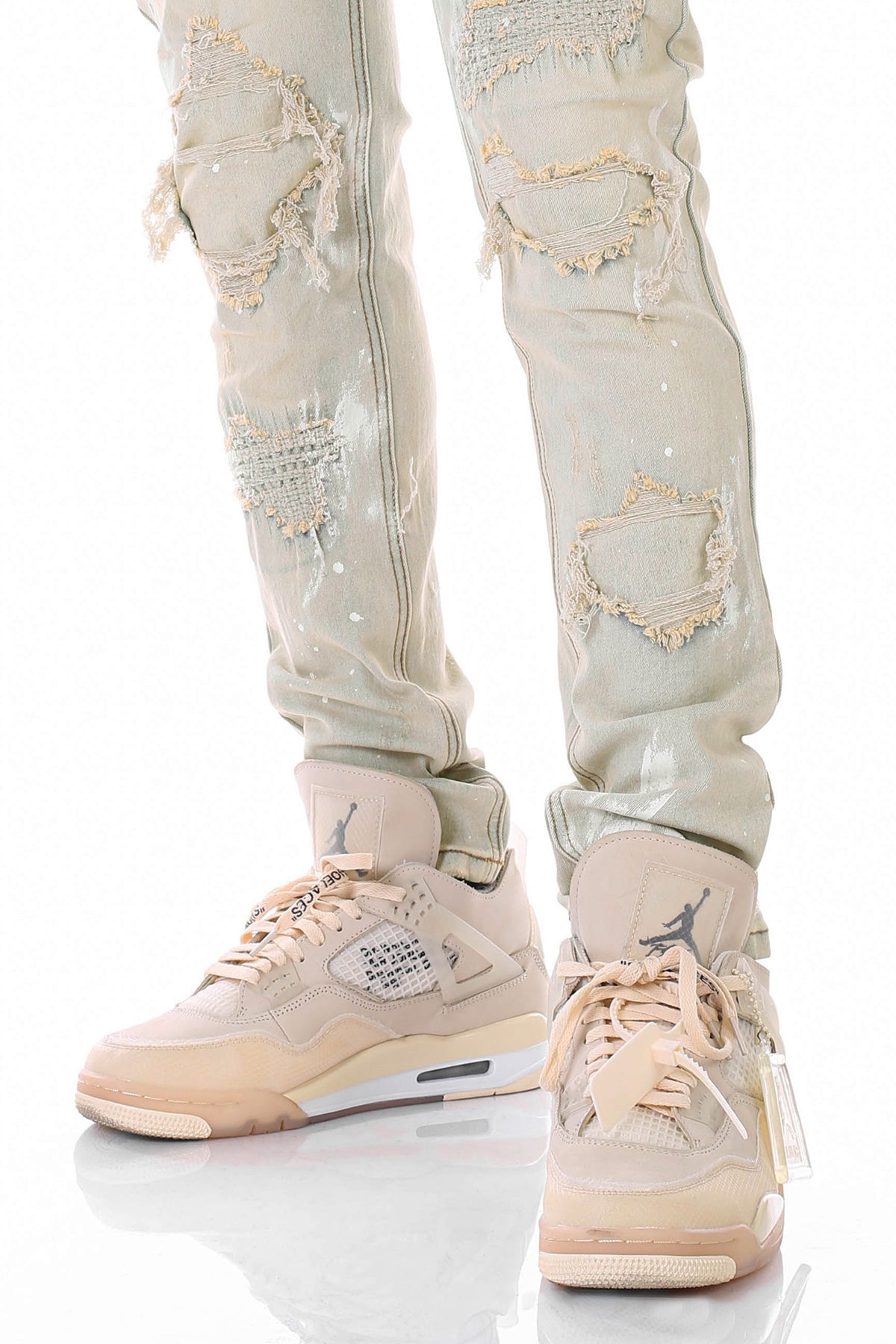 Ripped at knees. thighs & shanks with denim fabric patches inside