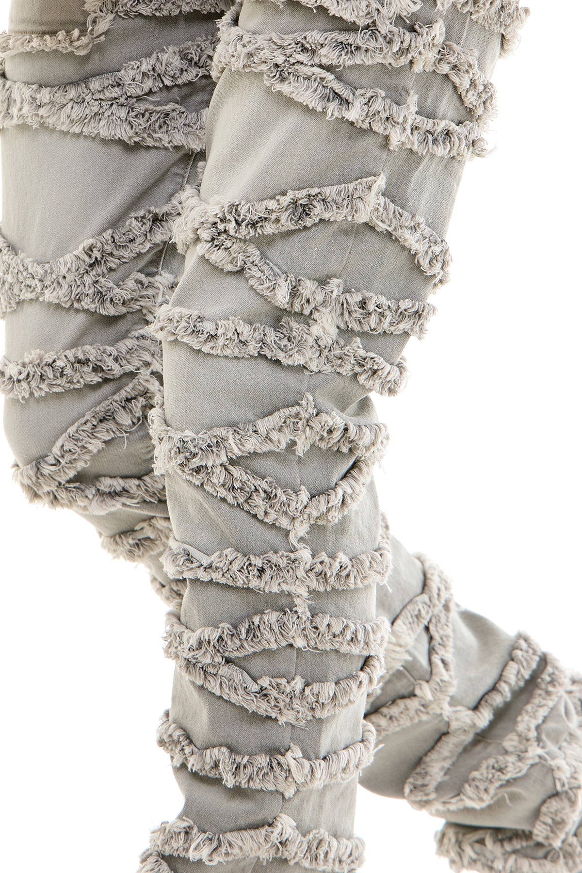 - Unique Layered & Frayed Design: Features intricate panels of frayed denim that create a distinctive, textured fringe effect down the entire leg.