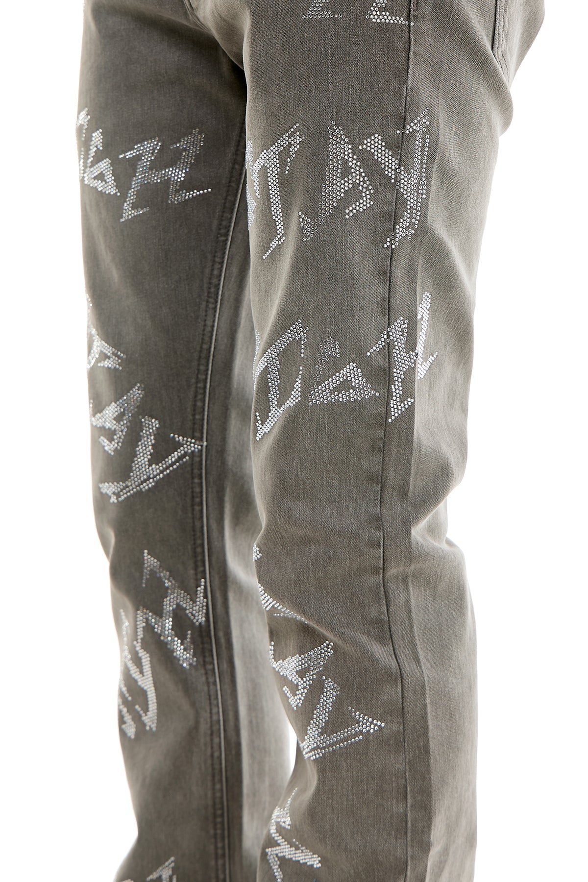 - Unique Rhinestone Lettering: Features bold, handwritten-style rhinestone text down the legs for a truly one-of-a-kind look.