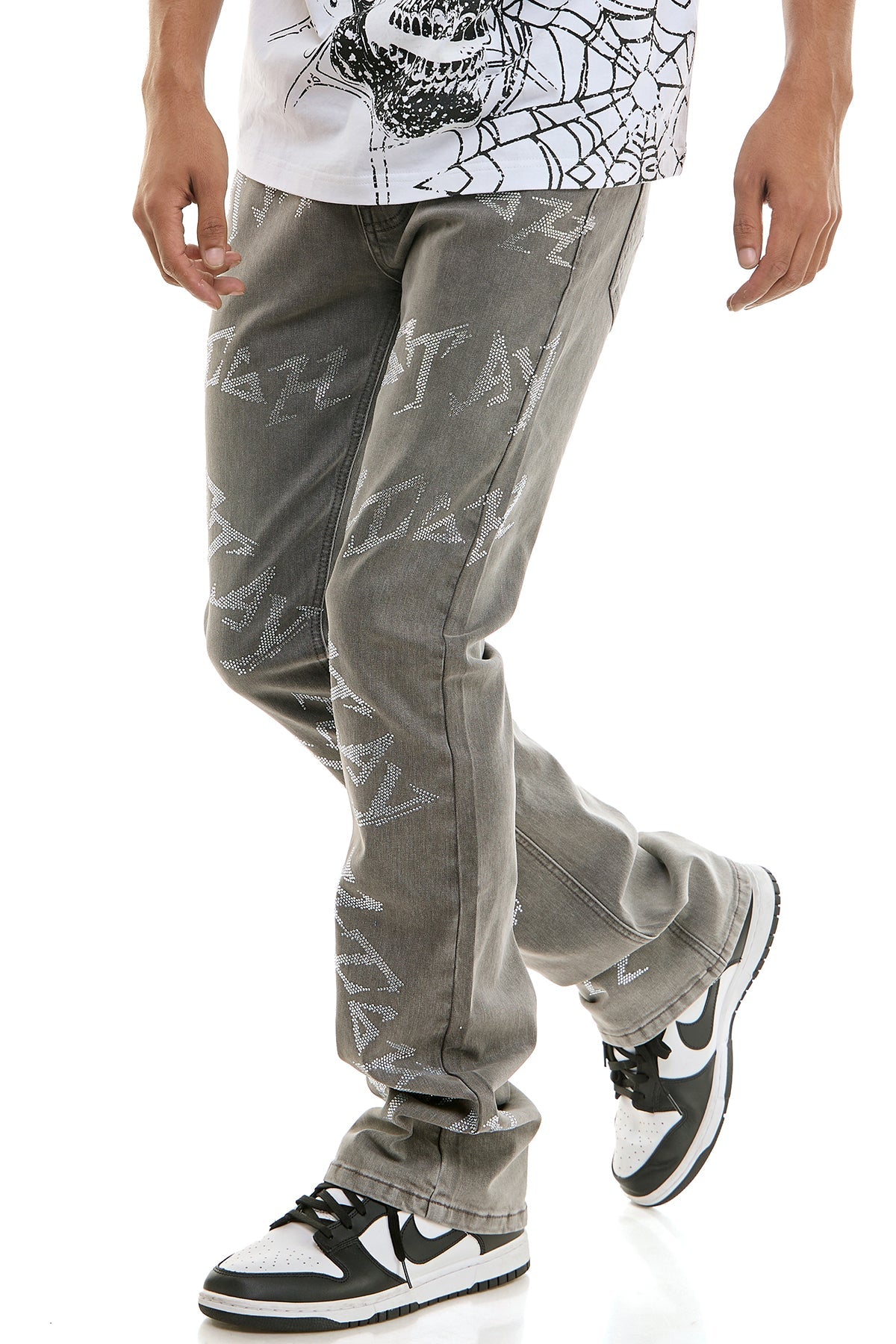 Express your style with the KDNK Stay High Rhinestone Skinny Flare Jeans, a unique and bold piece designed for those who want to make a statement. These exceptional men's rhinestone jeans are crafted from a premium 98% Cotton 2% Spandex stretch denim, providing superior comfort and a flexible fit that moves with you. The defining feature is the mesmerizing, handwritten-style rhinestone lettering that runs down the legs, creating a dazzling sparkle that contrasts beautifully against the medium grey denim. Engineered with a contemporary skinny flare fit, these rhinestone skinny jeans hug the leg closely before expanding into a dramatic flare at the ankle, achieving the perfect stacked silhouette over your favorite sneakers. Each pair comes complete with the signature KDNK brand tag, guaranteeing genuine quality and a unique design.